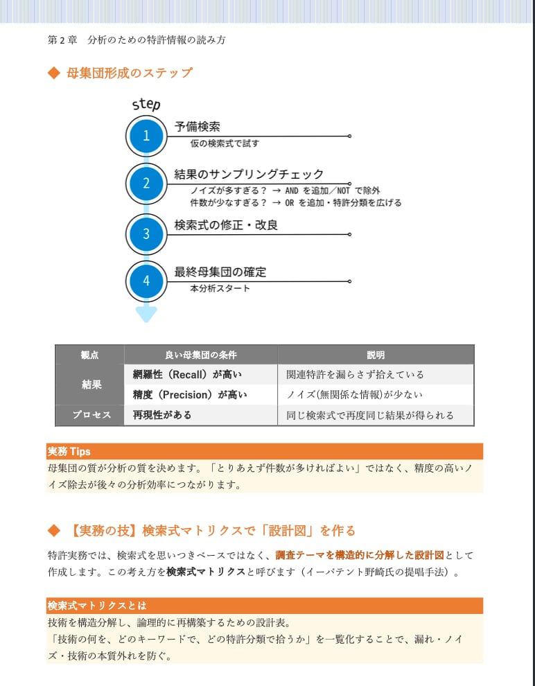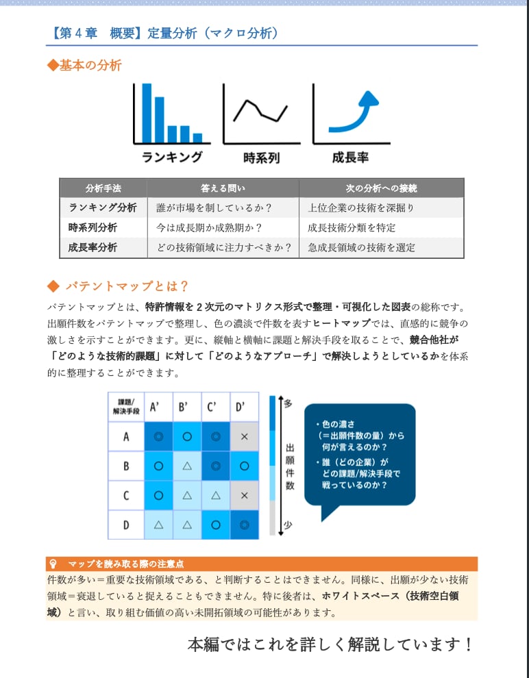 最大の特徴は、単なるツールの操作説明に留まらず、ビジネス課題から逆算した「分析設計(リサーチデザイン)」に重きを置いている点です。Excelを用いた定量分析(ランキング・時系列・成長率)から、大量の公報を可視化するテキストマイニング、さらには生成AIを活用した分析の高速化まで、現代の知財実務に必須のスキルを網羅しています。